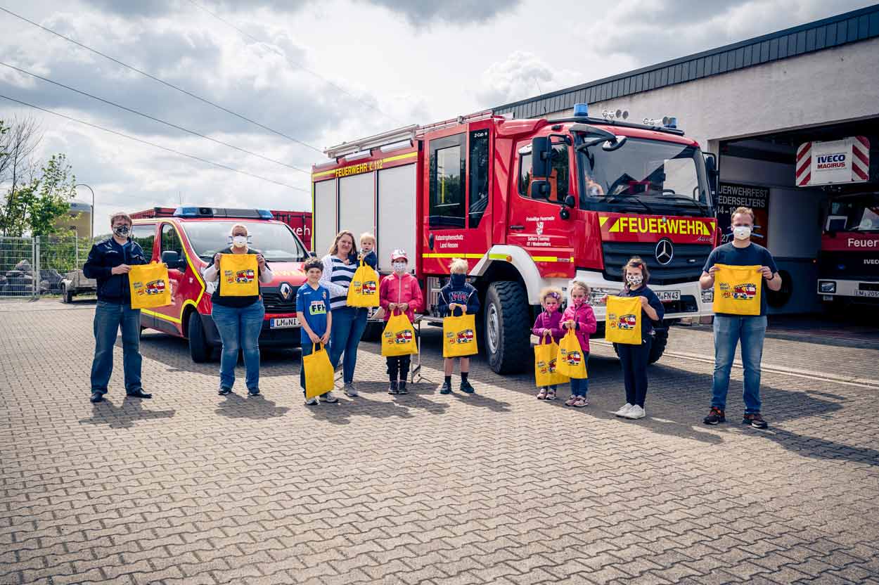 Selters. Im bereits 6. Jahr ihres Bestehens hatten sich die Betreuer/innen etwas überlegt, die Kinderfeuerwehr trotz Corona-Einschränkungen zu den Kindern zu bringen. Sie luden in allen vier Ortsteilen der Gemeinde Selters zu den Feuerwehrgerätehäusern. Haintchen, Münster, Eisenbach und Niederselters wurden so zu Sonntagsausflugszielen von jungen Familien. Fast 50 Kinder mit ihren Familien erreichte das Team der Kinderfeuerwehr „Löschküken“ mit dieser Aktion – selbstverständlich alle mit Mundschutz, nacheinander und mit Abstand. Die Freude der Kinder konnte man am funkelnden Strahlen der Kinderaugen wahrnehmen und sich mit freuen – die Kinder bekamen die unter anderem mit einem Stundenplan, Hausaufgabenheft, Malvorlagen, sowie einer Notrufkarte gefüllte „Löschkükentüte“ direkt aus dem Feuerwehrauto – Sozusagen Kinderfeuerwehr „to go“, freute sich Initiatorin Bärbel Muth mit Benedict Clemenz. Alle freuen sich schon jetzt, wenn es hoffentlich bald wieder losgeht mit den regelmäßigen Treffen der Kinderfeuerwehren. Wer die Aktion verpasst hat, kann gerne mit der Kinderfeuerwehr Kontakt aufnehmen und sich informieren unter www.Feuerwehr-Niederselters.de (Text: Peter Ehrlich / FOTO-EHRLICH.de).