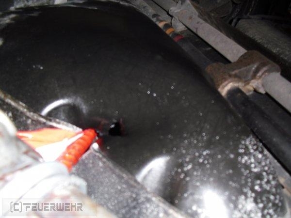 Ein Fahrzeug hatte sich ein Teil einer Absperrung in den Tank gestochen. Er merkte dieses nicht und fuhr ein paar hundert Meter bis der Tank leer war.