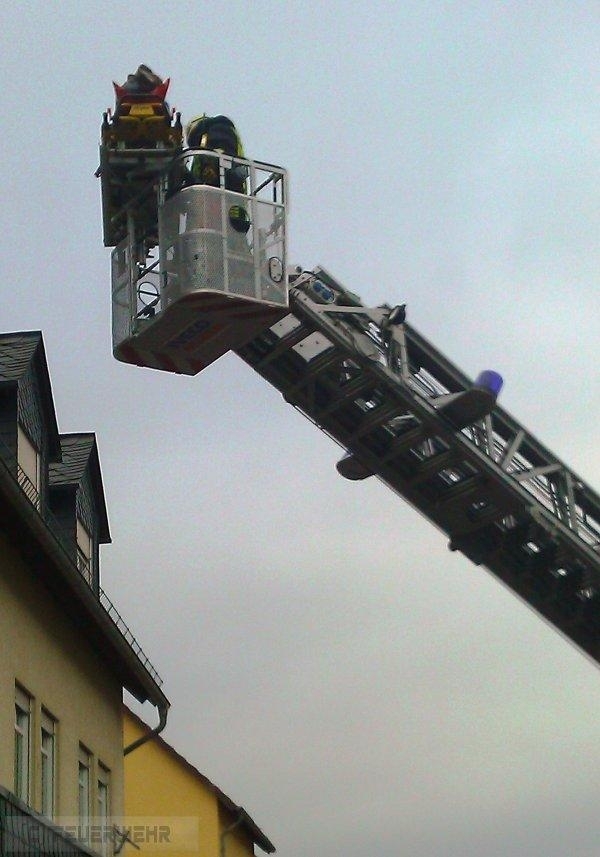 Patient im 1. OG vom Rettungsdienst betreut wurde via Drehleiter aus dem 1. OG gerettet und an den Rettungsdienst übergeben.