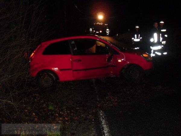 Ein Pkw befindet sich im Graben, Fahrerseite ist in die Baumreihe gedrückt, keine eingeklemmten Personen mehr im Auto.