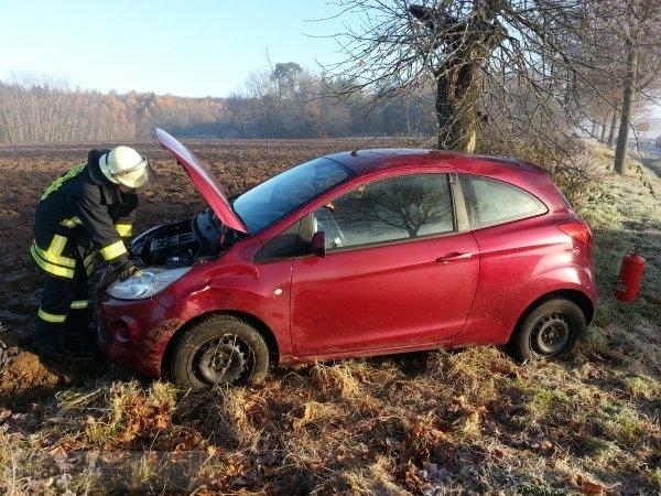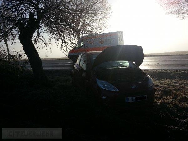 PKW kommt vermutlich wegen glatter Fahrbahn von der Fahrbahn ab, und liegt auf der Seite, Sicherstellung Brandschutz und Fahrzeug wieder auf die Räder gestellt