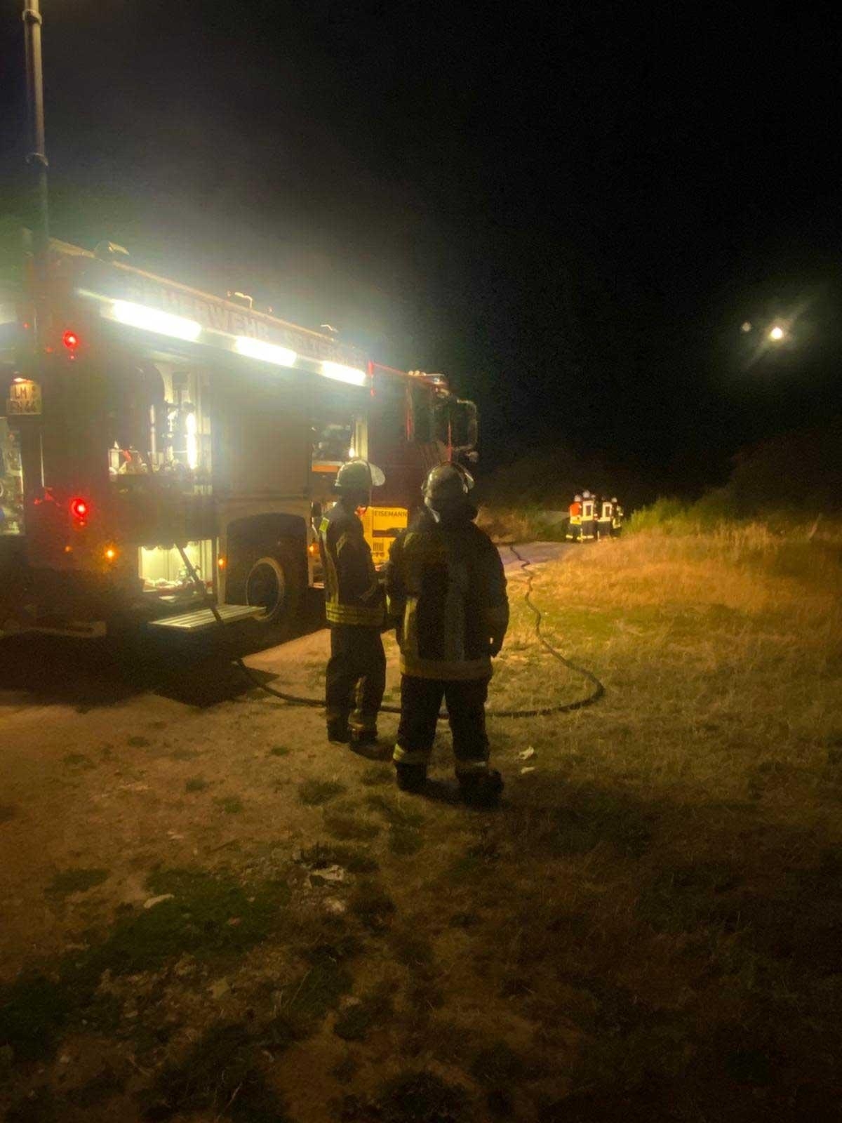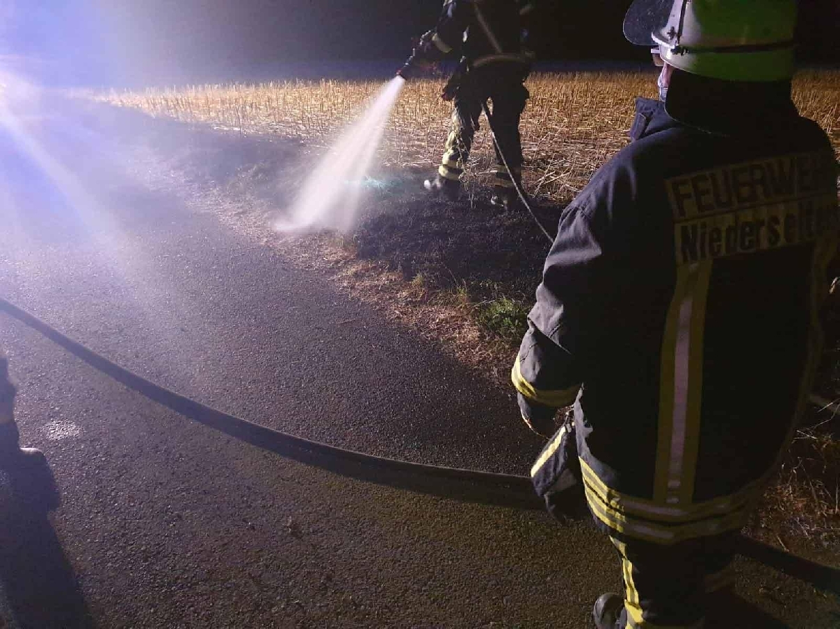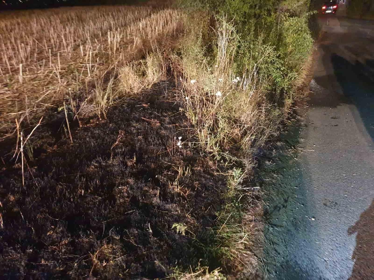 Der Rand eines Stoppelfeldes brennt auf einer Länge von ca. 10 m.