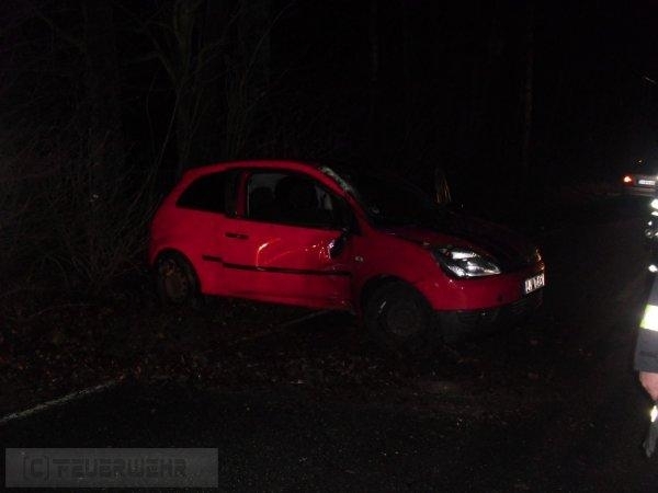 Ein Pkw befindet sich im Graben, Fahrerseite ist in die Baumreihe gedrückt, keine eingeklemmten Personen mehr im Auto.