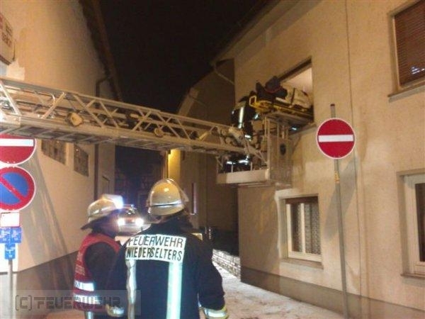 Patient im 1. OG vom Rettungsdienst betreut wurde via Drehleiter aus dem 1. OG gerettet und an den Rettungsdienst übergeben.