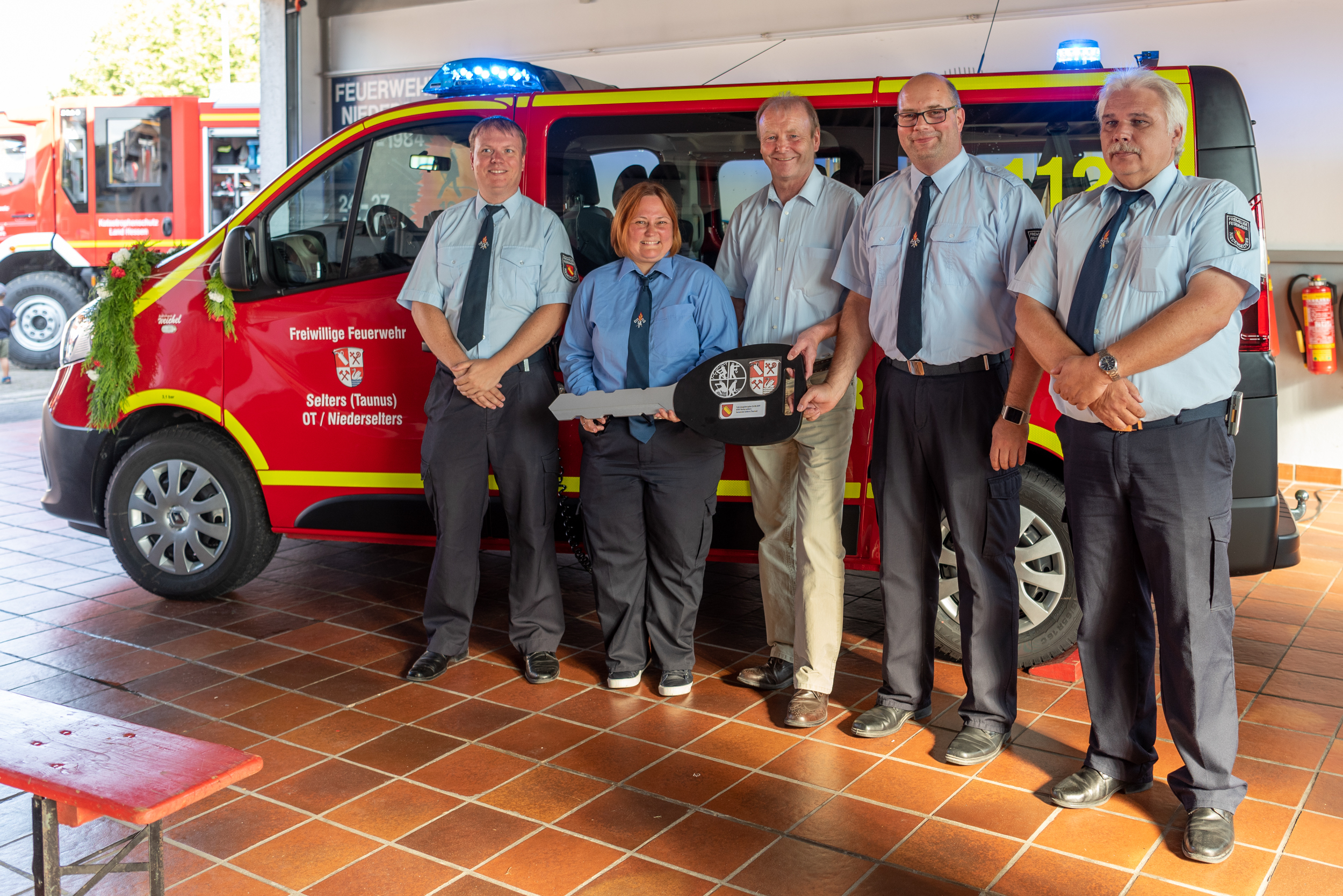 v.l.n.r. Stellvertretender Wehrführer Thomas Dettmann, Leiterin der Kinderfeuerwehr, Janine Dobbrick-Dettmann, Bürgermeister der Gemeinde Selters, Bernd Hartmann, Jugendfeuerwehrwart Manuel Clemenz und Wehrführer Theo Neckermann vor dem neuen Fahrzeug bei der Schlüsselübergabe